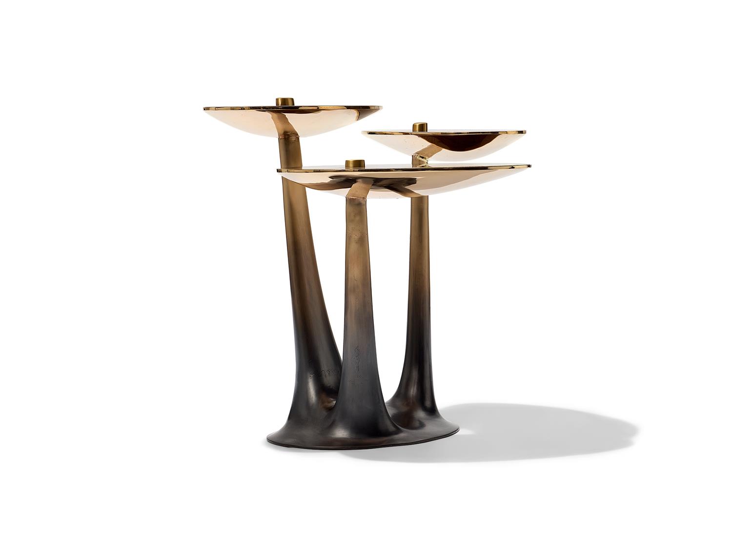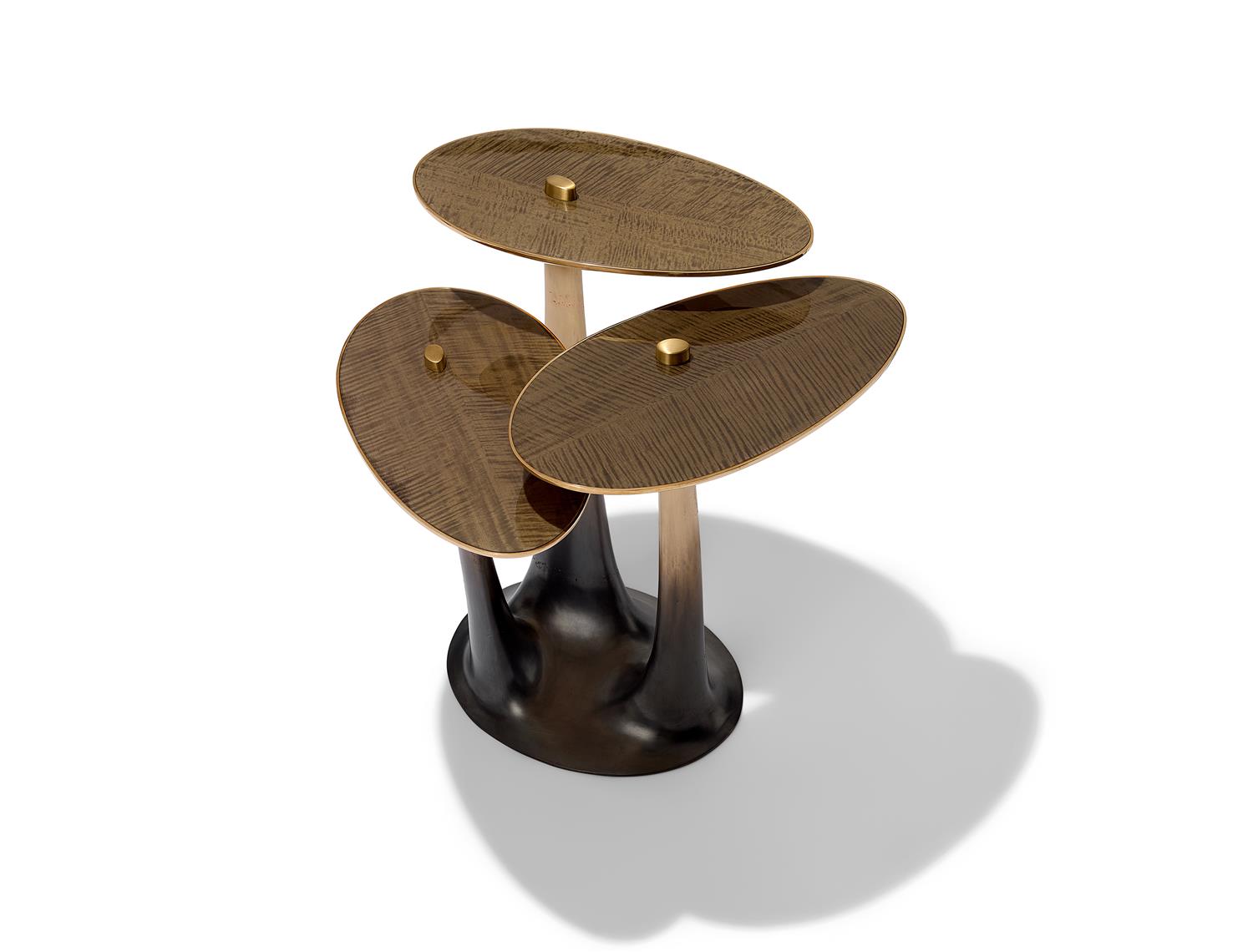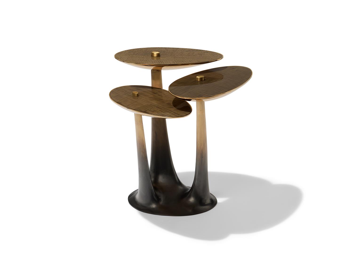 The Lily Side Table captures the graceful rhythm of nature through its fluid composition. Three polished wood tops rest at varying heights, echoing the organic arrangement of lily pads. Each top is supported by a cast bronze stem that flows seamlessly into a sculptural base, creating a harmonious play between balance and movement. A functional yet striking design, Lily offers elegance from every angle.